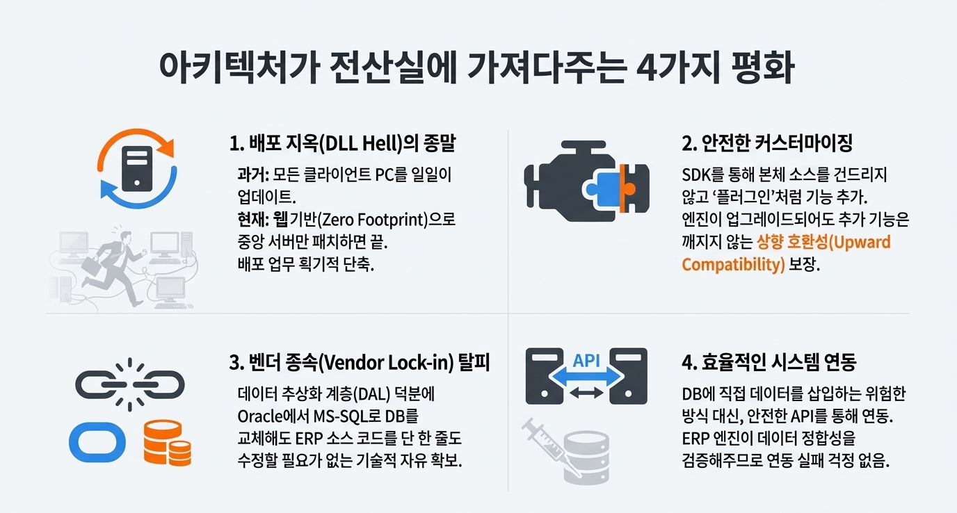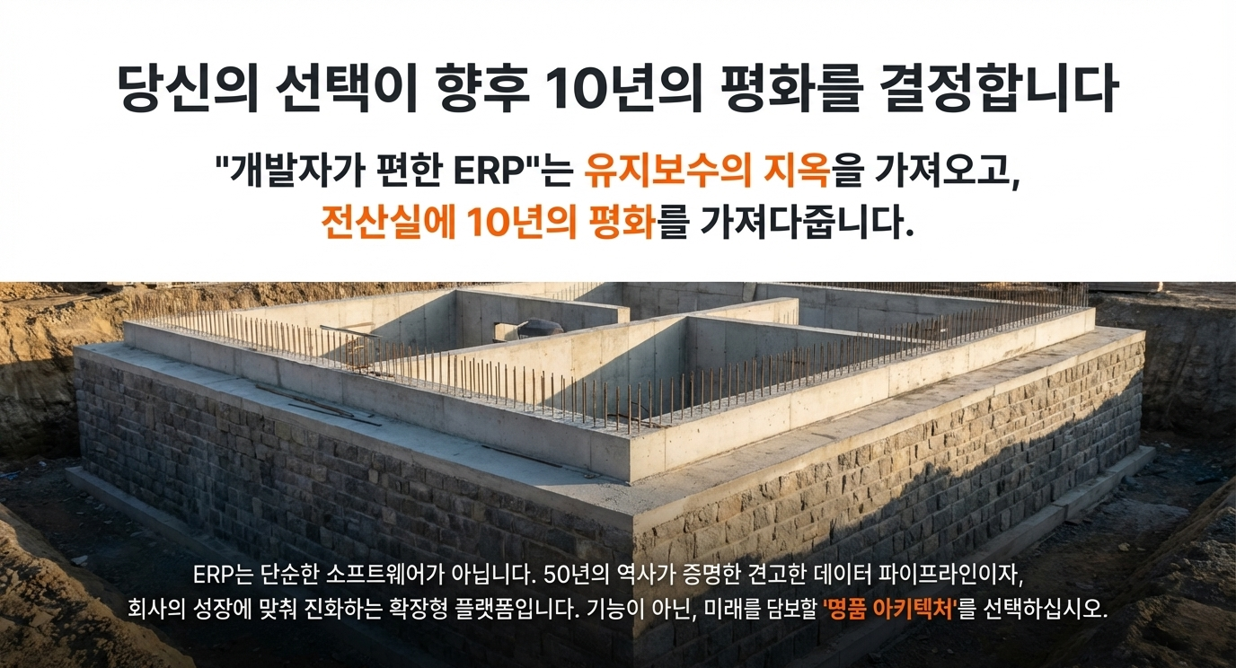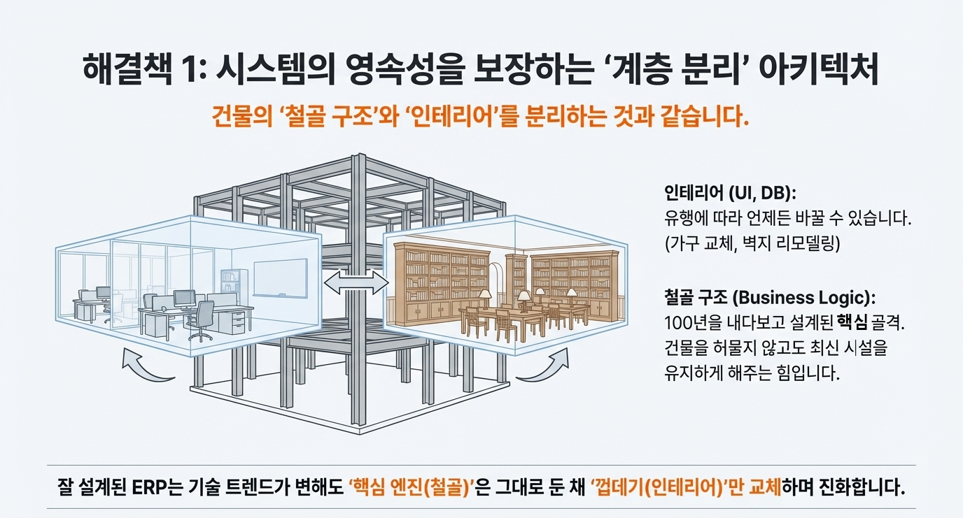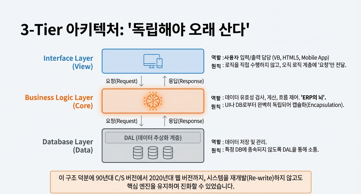 . 💡 선진 ERP의 특징: UI가 DB에 직접 쿼리를 보내지 않고, 반드시 이 **로직 층(View/Super View)**을 통과하도록 설계되어 시스템 안정성을 보장합니다.