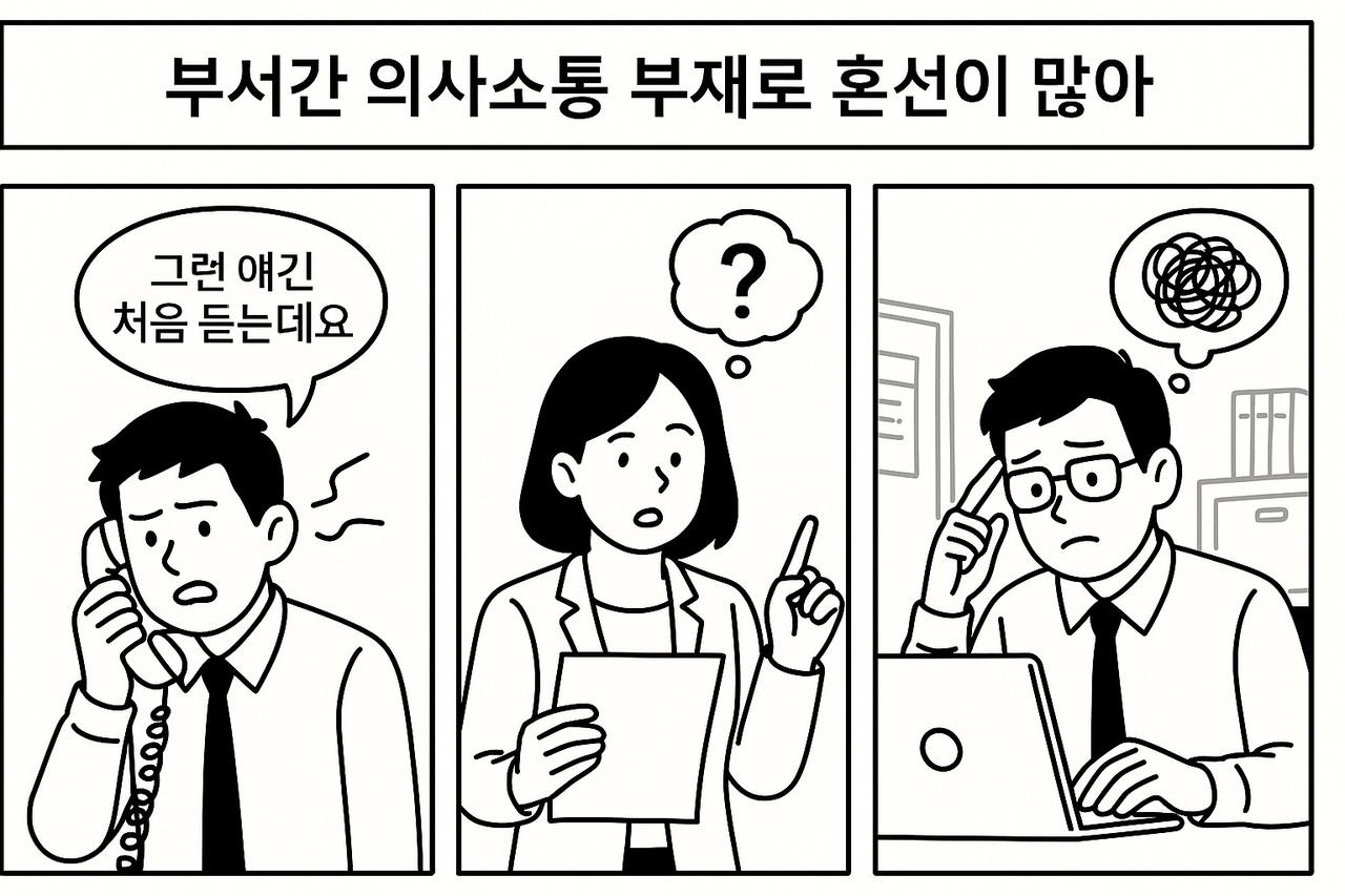 결론: 부서 간 소통 단절 심화, 협업없는 비효율 확산, 고객응대 지연, 생산 일정 차질, 잘못된 자금계획 수립 등이 발생됩니다.