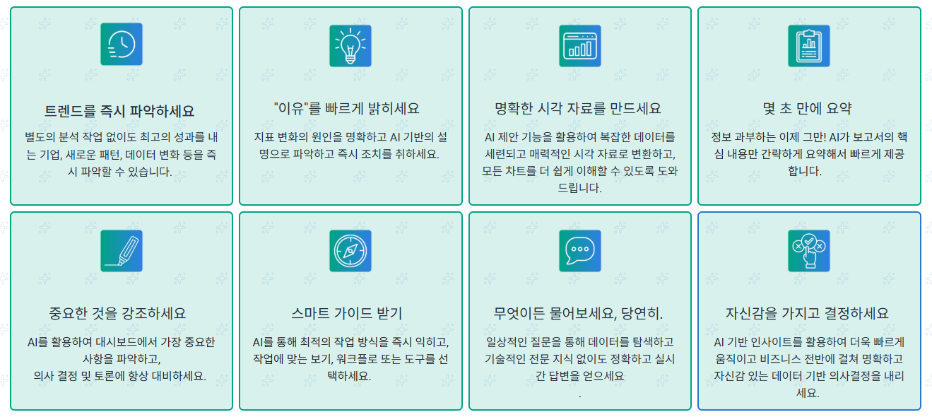 핵심 사업 및 결과를 효과적으로 제시하는 방법, 그리고 다음에 탐색해야 할 내용에 대한 스마트한 맞춤형 추천을 통해 인사이트를 실행으로 유연하게 옮길 수 있습니다.