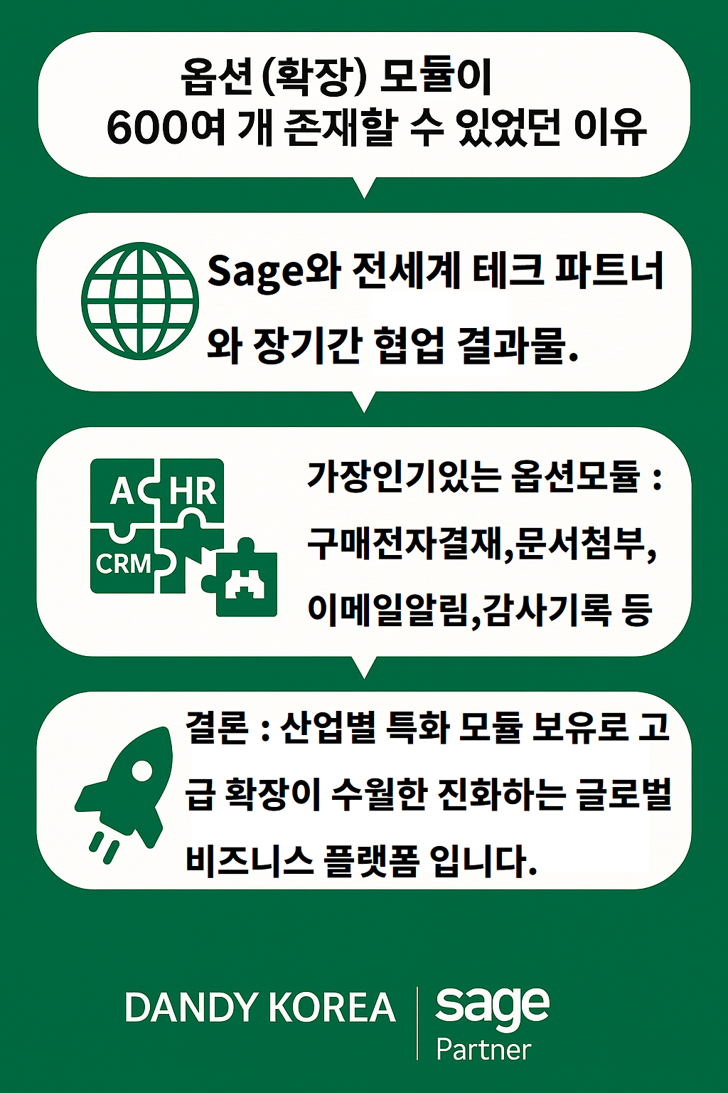 🔮 옵션 모듈은 Sage와 전세계 Tech Partner간 수십년가 만들어낸 생태계 결과물입니다.