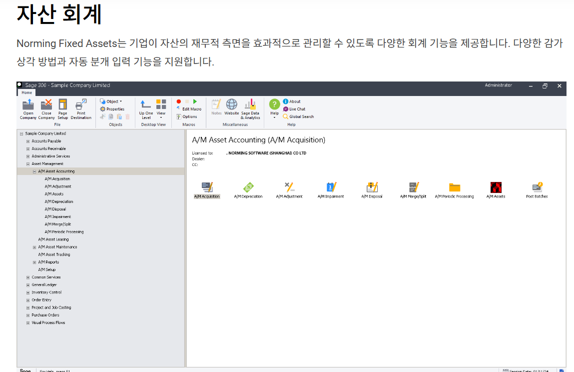 ❎ Sage 300의 고정자산의 개발사는 캐나다 Norming 입니다. 주요기능은 고정자산의 취득, 감가상각, 처분 등의 고정자산의 핵심 기능을 모두 제공합니다.