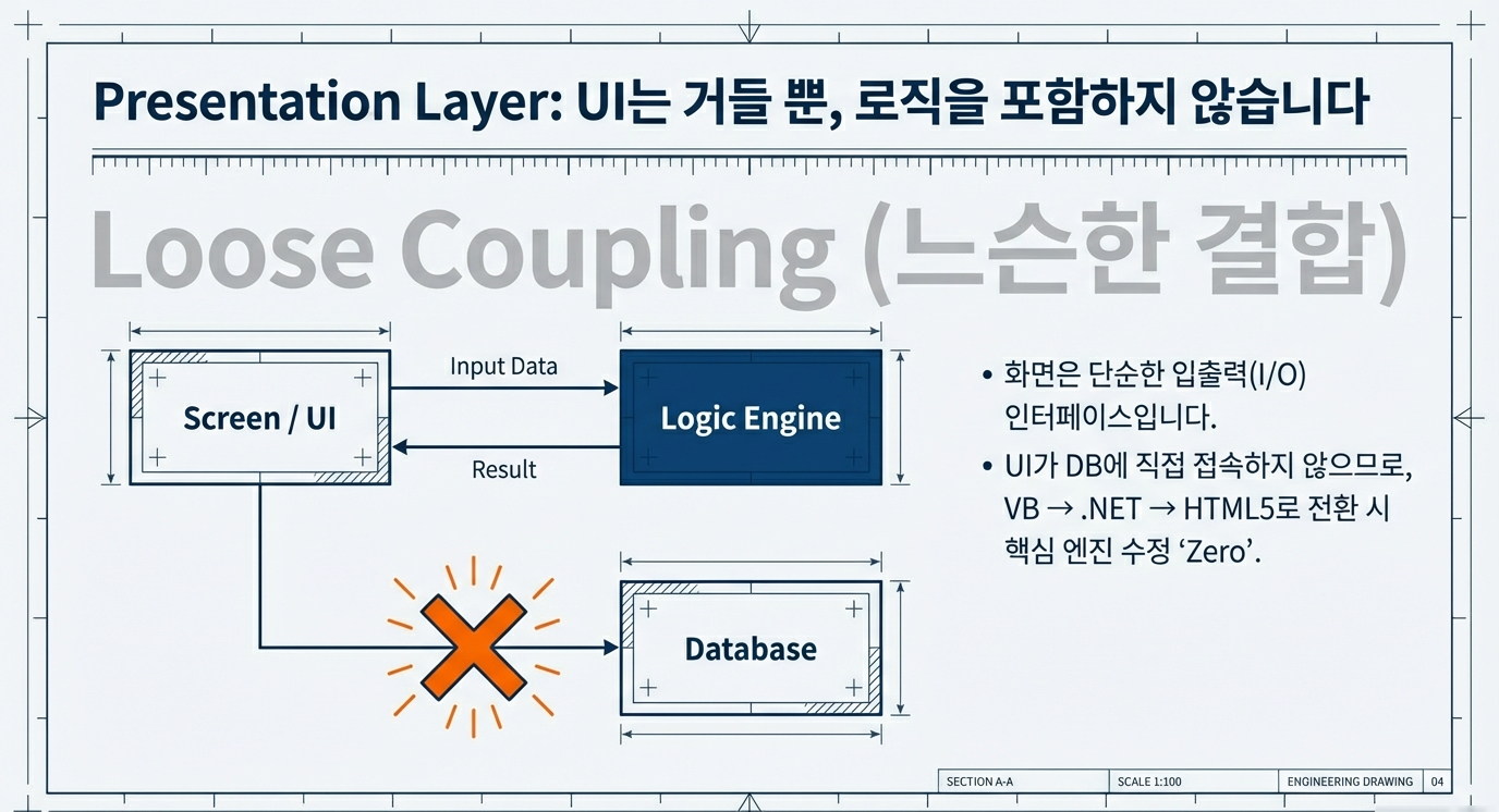 . 화면은 단순한 입출력 인터페이스입니다. UI가 DB에 직접 접속하지 않으므로 VB->.NET -> HTML5 로 전환시 핵심 엔진 수정은 없습니다.(Zero)