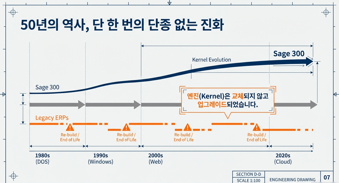 . Sage 300은 1976년 DOS부터 2026년 클라우드 까지 변함없이 최신기술을 접목하여 업그레이드 되었습니다.