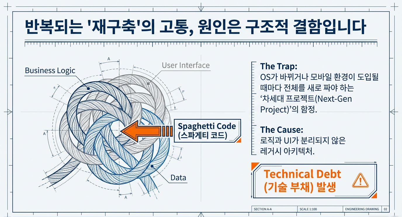 🔗 OS가 바뀌거나 모바일 환경이 도입될 때마다 전체를 새로 짜야하는 '차세대프로젝트'의 함정을 경험하셨지요.