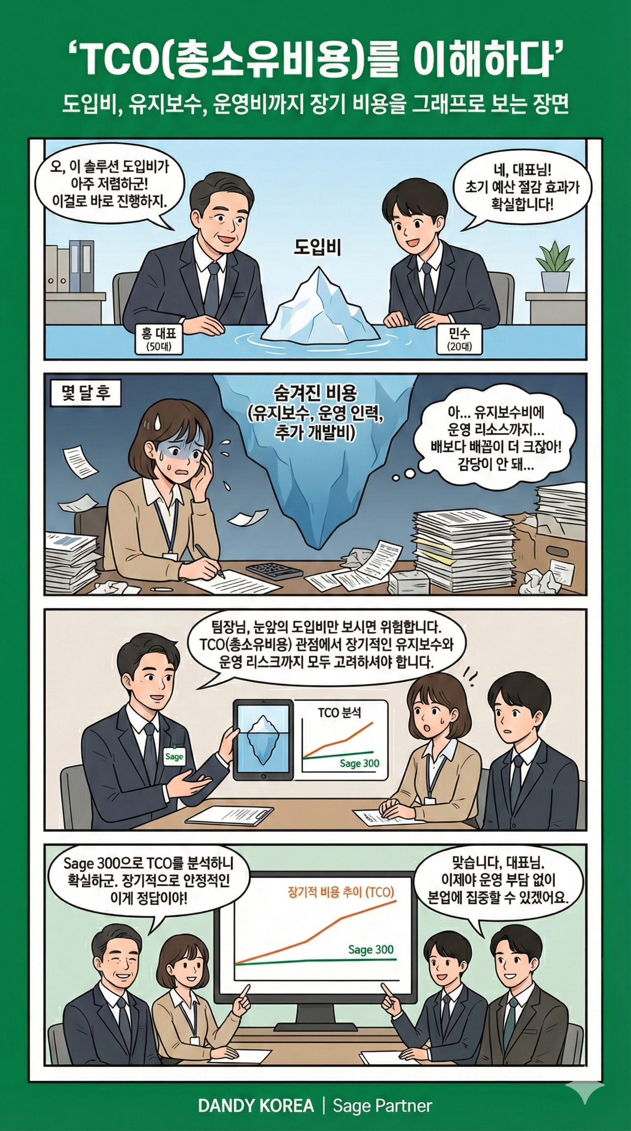 ERP 프로그램도입시의 도입비, 구축비, 유지보수비, 운영비까지 총소요비용을 그래프로 보는 장면입니다.