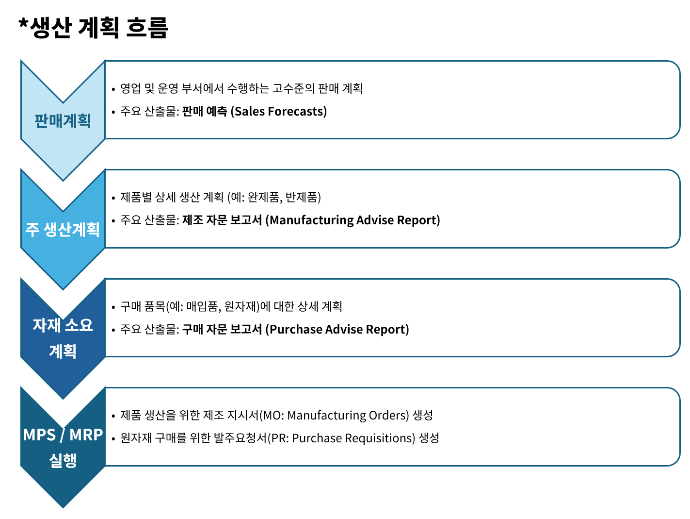 이를 통해 기업은 수요·재고·구매·생산 데이터를 통합적으로 반영한 현실적인 생산 계획을 수립할 수 있습니다.