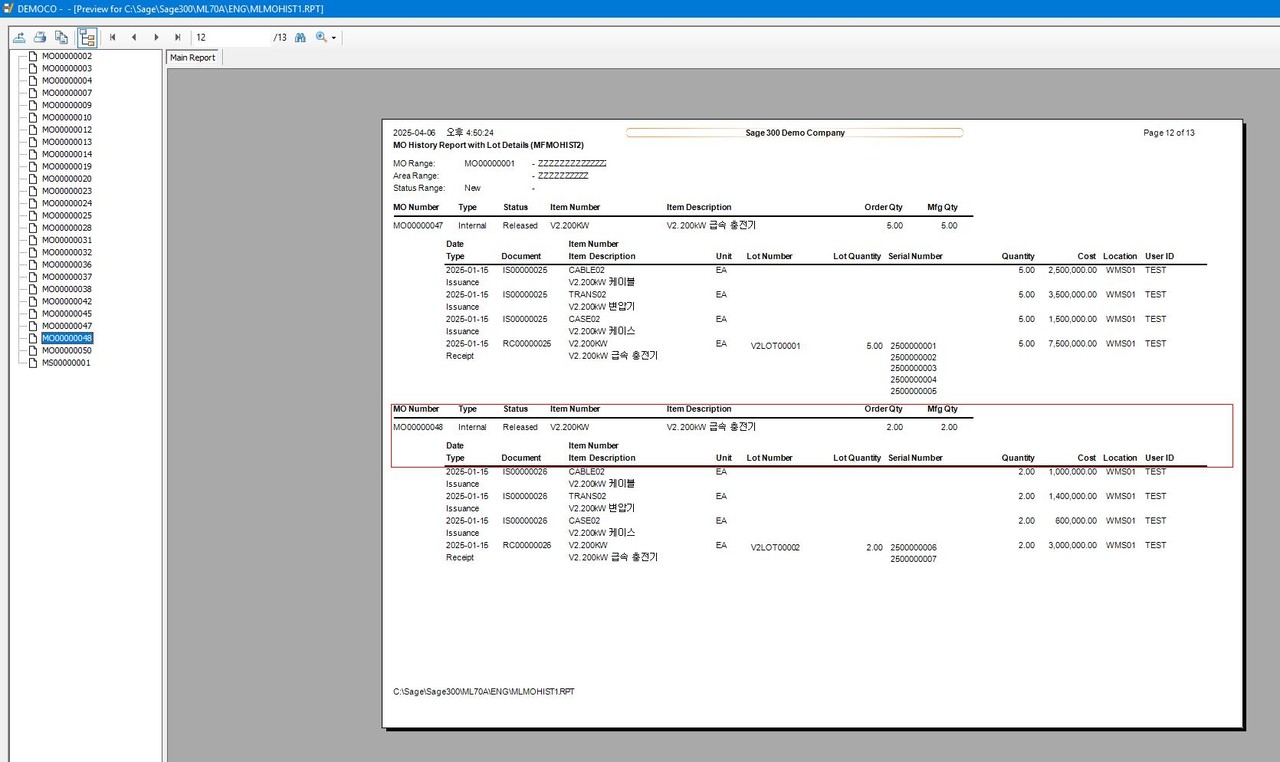 Sage 300 생산관리모듈의 Serial & Lot Tracking 기능은 생산 과정에서 발생하는 모든 시리얼 번호와 로트 번호의 이력을 체계적으로 기록하고 보고서 형태로 제공합니다.