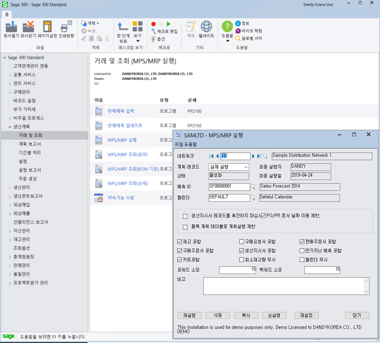 생산 계획은 제조 BOM 정보와 Sage 300의 판매(O/E), 재고(I/C), 구매(P/O) 데이터를 기반으로 전체 규모의 **MPS(생산 계획) 및 MRP(자재 소요량 계획)**을 생성합니다.