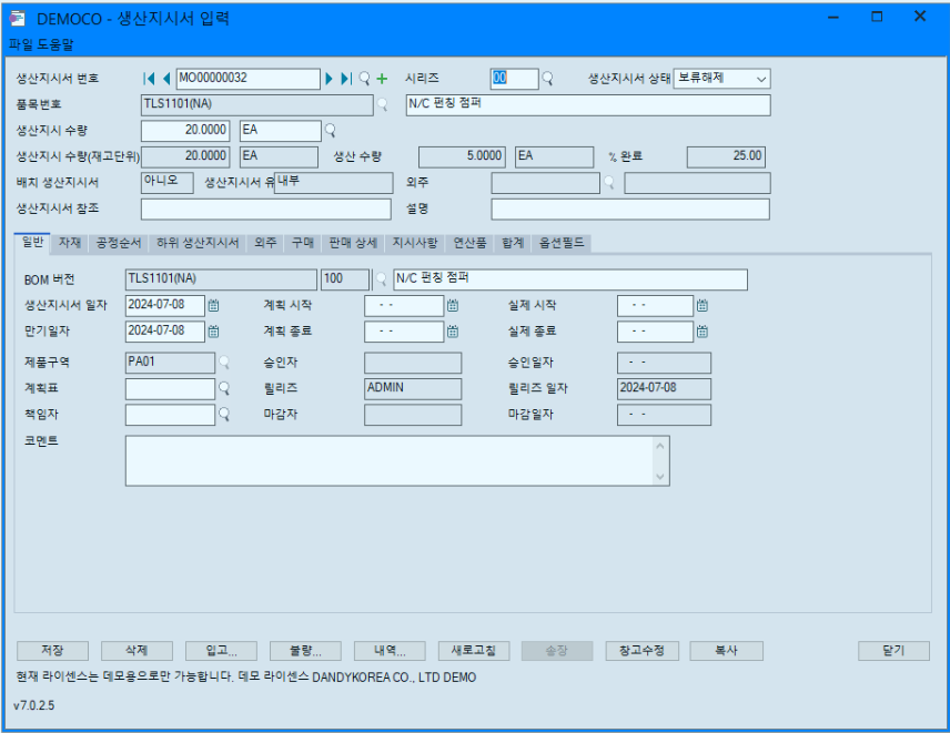 ⛳생산지시서 마스터 화면에는 일반 정보 외에도 다음과 같은 상세 탭이 제공됩니다.