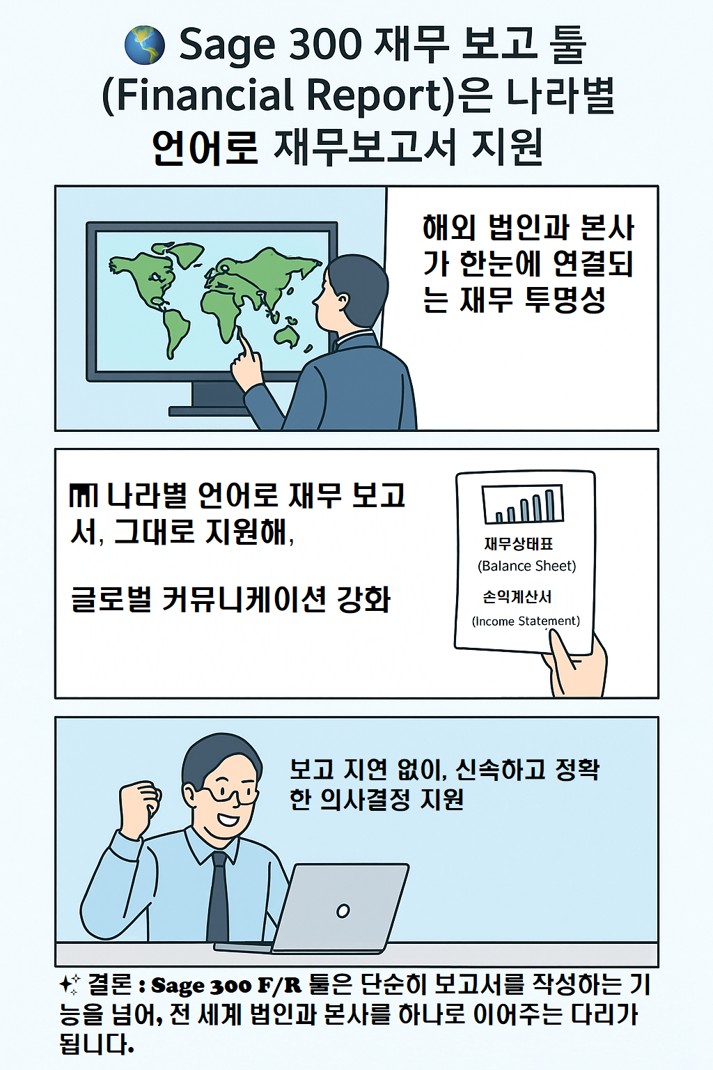 🌐 세계 곳곳에 뿌리내린 여러분의 기업을 하나의 통합된 Sage 300 ERP 시스템으로 모두 연결할 수 있습니다.