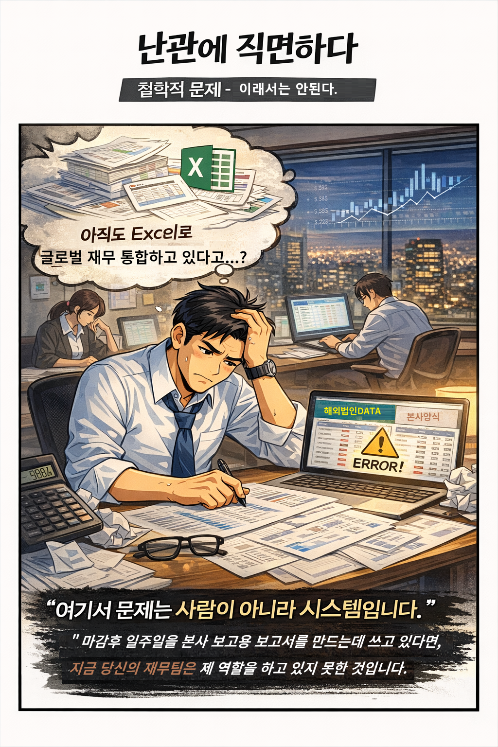 "월말만 되면 팀 전체가 Excel에 묶입니다. 이게 정말 우리가 해야 할 일일까요?"