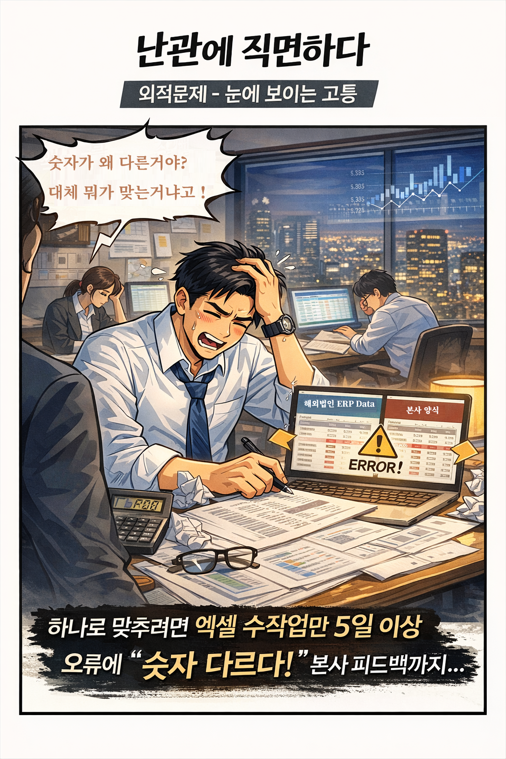 매월 야근과 엑셀에 갇힌 나의 팀... ( 해외지사 재무팀장님 모습 )