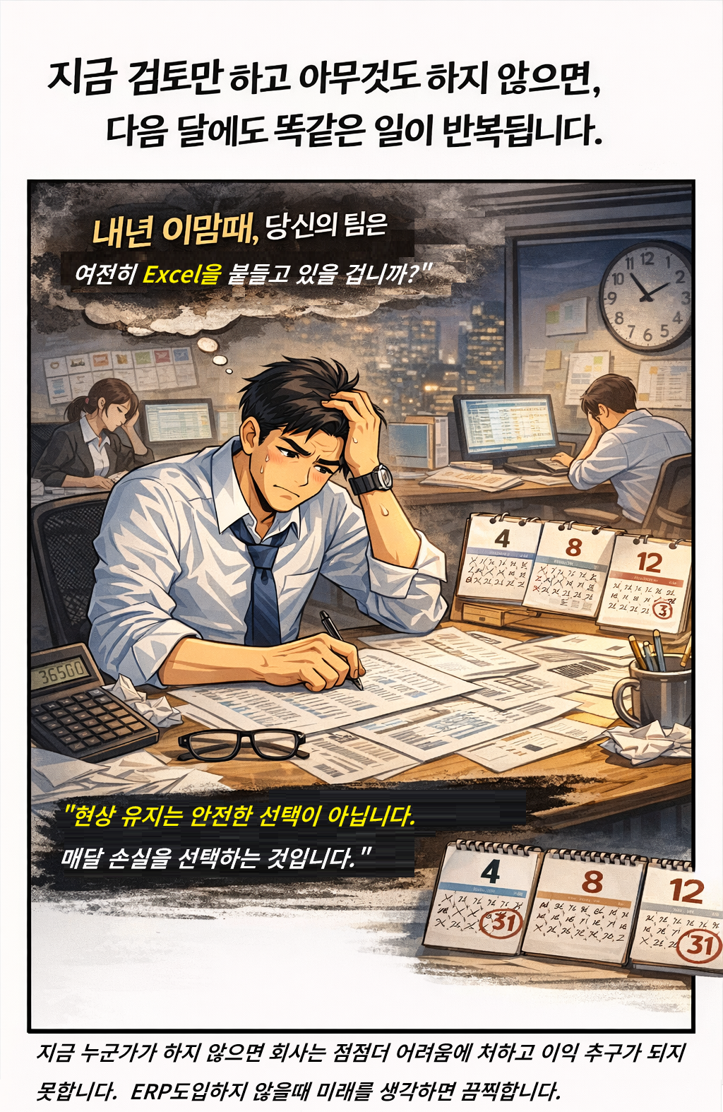 결론 : 고객님, 지금 누군가가 하지 않으면 회사는 점점더 어려움에 처하고 이익 추구가 되지 못합니다. 고객님, ' ERP 도입 하지 않았을 때의 직원분의 미래'를 생각해 보십시오,