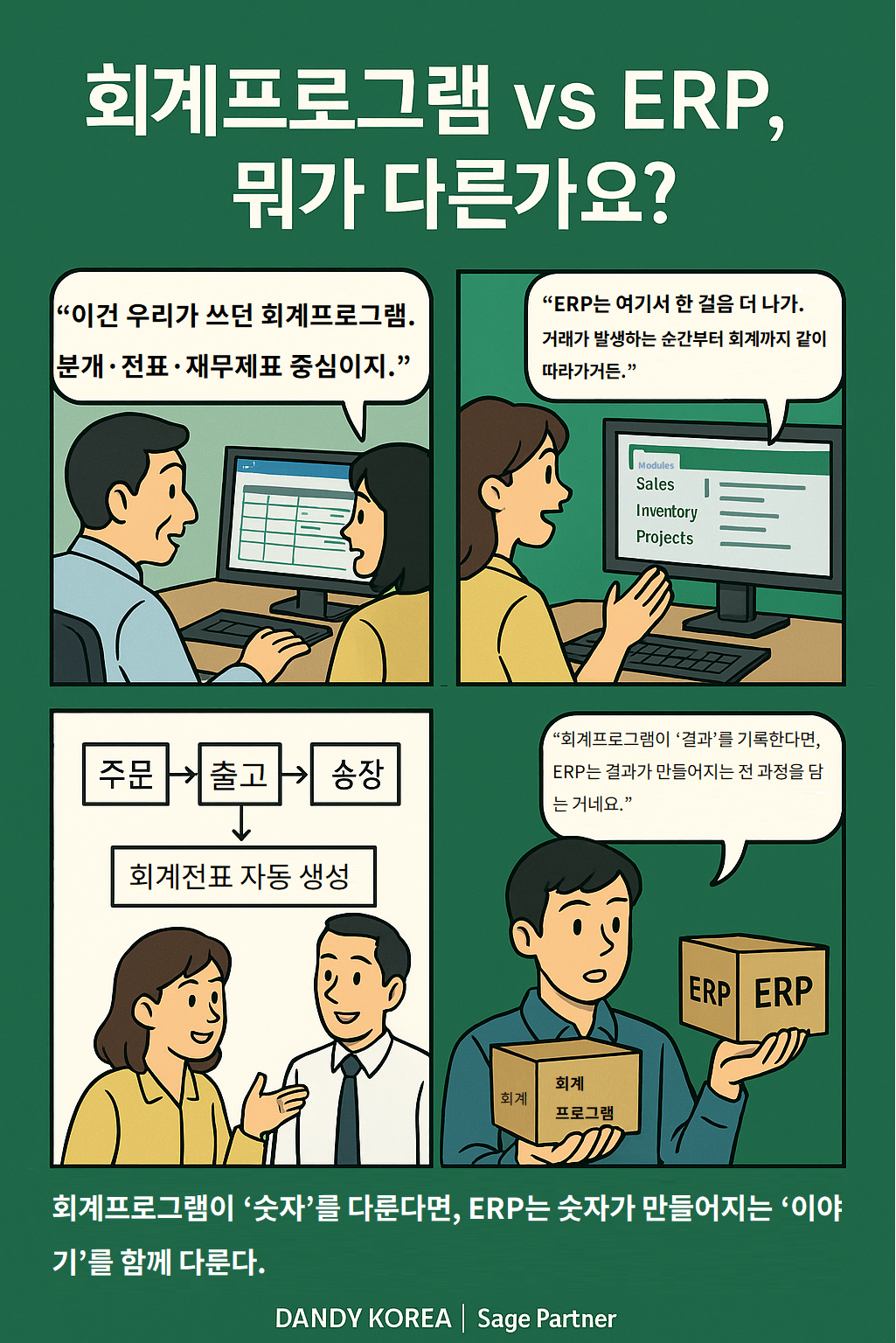 회계프로그램이 ‘숫자’를 다룬다면, ERP는 숫자가 만들어지는 ‘이야기’를 함께 다룬다.