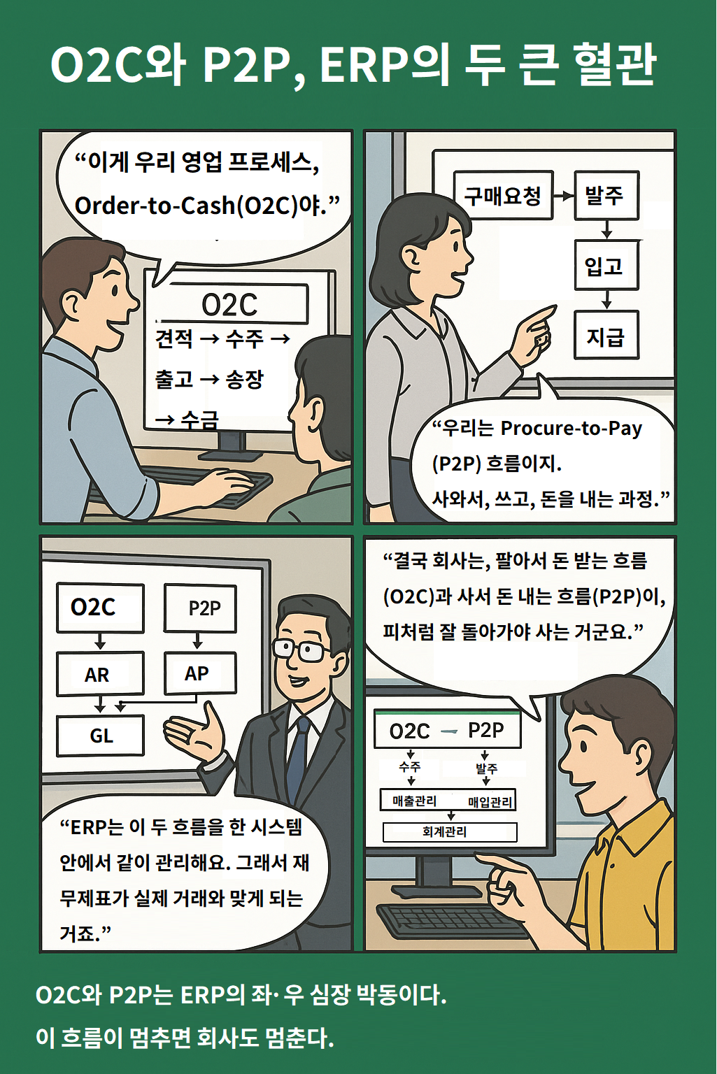 “결국 회사는, 팔아서 돈 받는 흐름(O2C)과 사서 돈 내는 흐름(P2P)이 피처럼 잘 돌아가야 사는 거군요.”