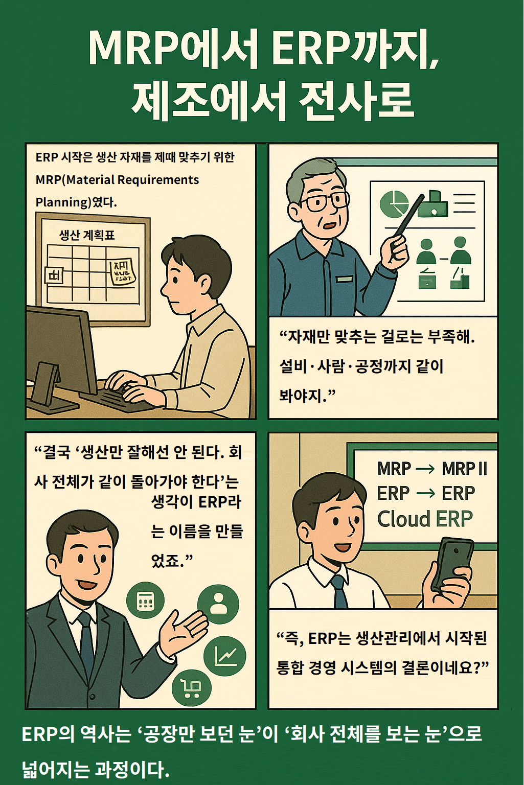 ERP의 역사는 ‘공장만 보던 눈’이 ‘회사 전체를 보는 눈’으로 넓어지는 과정이다.