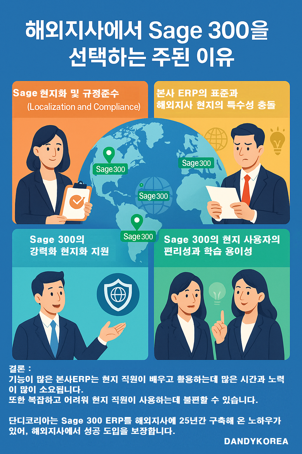 🌐 당사가 직접 해외 출장으로 Sage 300을 전세계 지역에 적용으로 전세계 지역에서 기술력 검증을 받았습니다.